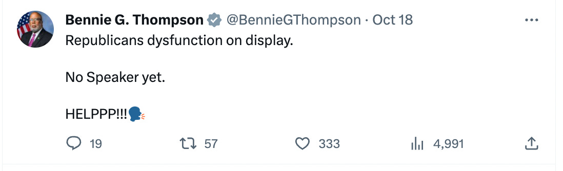 “You might have noticed that we’re having a little issue in Washington,” he said. “We have not been able to pick a speaker and for the last few days, we’ve been in suspended animation. What a way to run a government, right?”