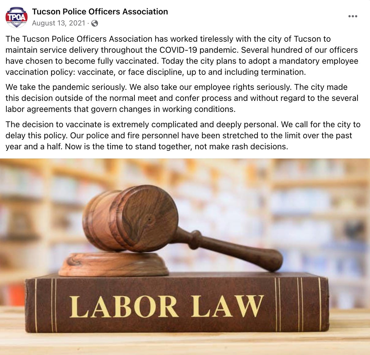 In August 2021, the Tucson Police Officers Association and Tucson Fire Fighters Association sued the city over a COVID-19 vaccine requirement for all city employees.