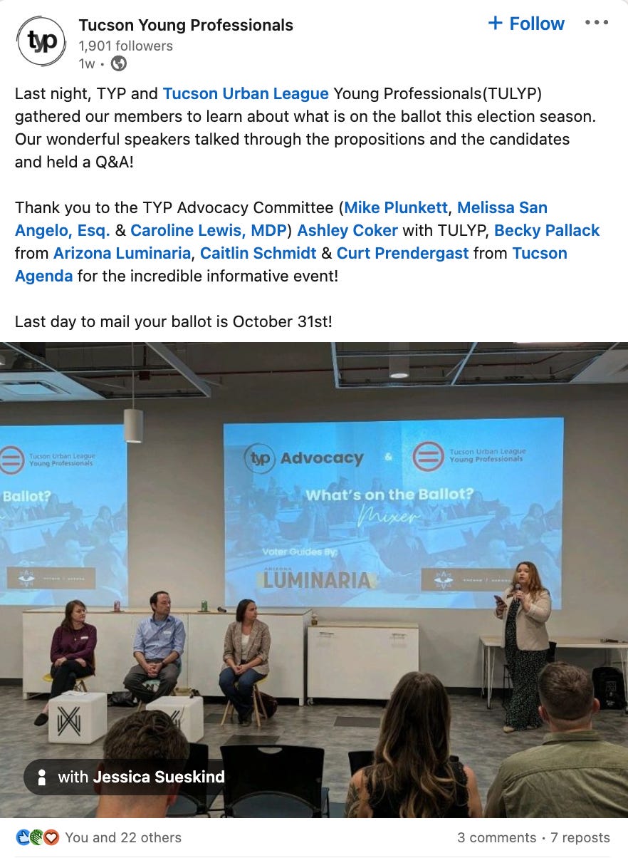 We attended Tucson Young Professionals and Tucson Urban League Young Professionals mixer where we, along with the Arizona Luminaria’s Becky Pallack, got to talk about tomorrow’s city election and break down the ballot. We had a lot of fun! And it was nice to know so many voters care about an off-year city election.