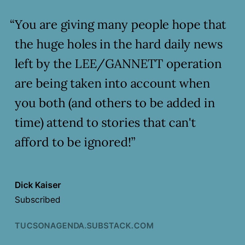 Other readers said they were hopeful we could avoid the pitfalls of corporate-owned news outlets. Every dollar you pay us stays here in Tucson and helps us do a better job. We have no shareholders to satisfy and no hedge fund demanding a return on their investment. It’s just us. And you.
