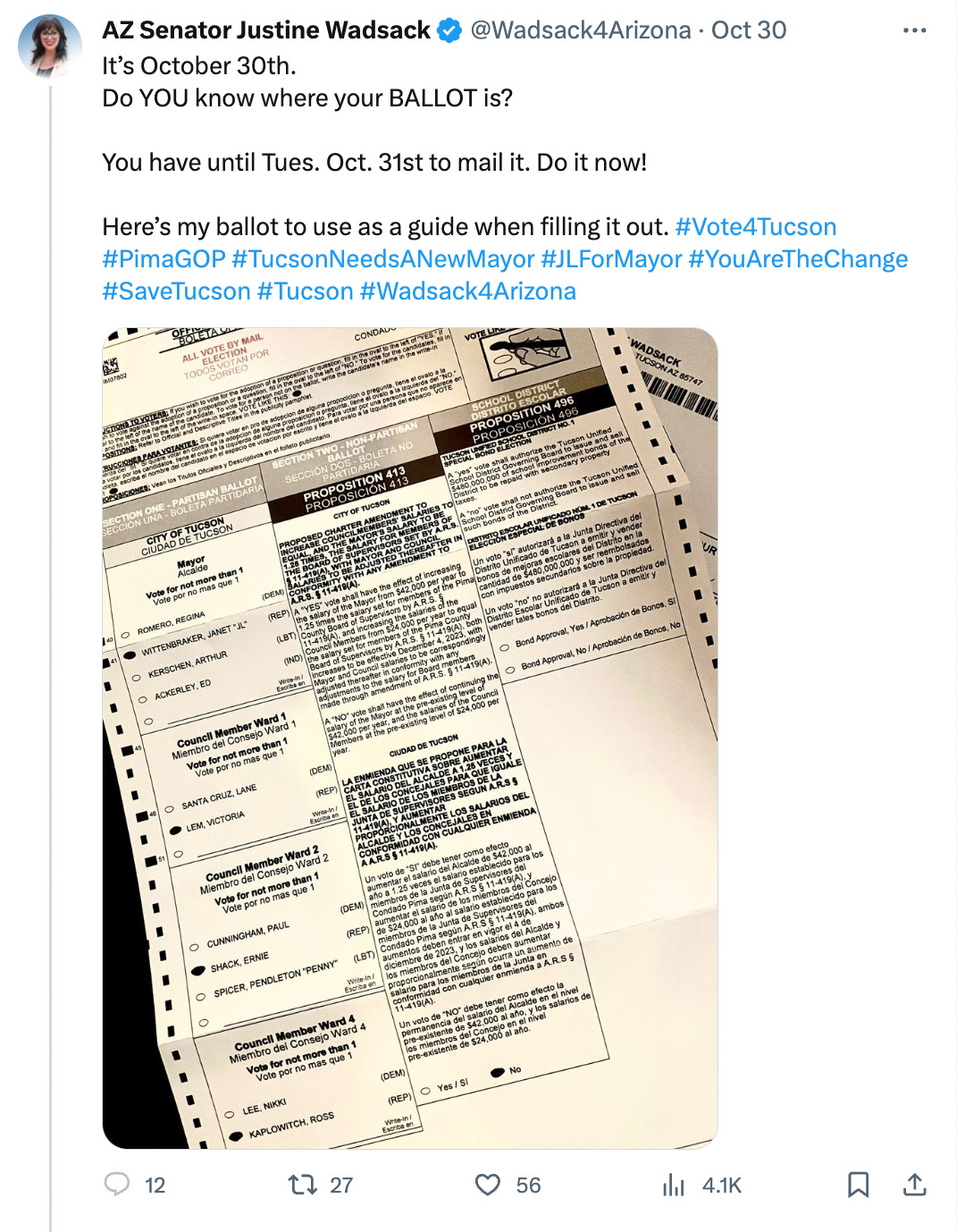Ballot bind: Sen. Justine Wadsack may have broken the law last week when she tweeted a photo of a ballot she claims is hers, but that officials say can’t actually be hers, the Tucson Sentinel’s Dylan Smith writes. The ballot pictured in the photo tweeted by Wadsack includes a proposition she’s not eligible to vote on, since it’s in a different precinct, but Wadsack publicly doubled and tripled down on her claims that it’s hers.
