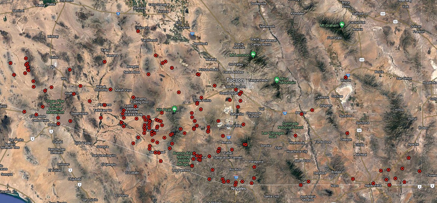 157: The number of remains of migrants found in Southern Arizona so far this year, according to the Pima County Medical Examiner. On the map below, which the Tucson-based aid group Humane Borders created in collaboration with the medical examiner, each red dot represents a set of human remains.