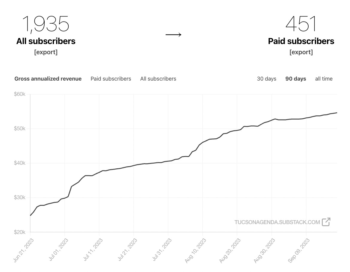 451: The number of paid subscribers that are reading the Tucson Agenda. We told you in our one-month update that we need about 900 paying subscribers to make it through our first year, and we’re officially halfway there! We’re also really close to hitting 2,000 total subscribers, so how about you share our work with some friends and help us round out that number?