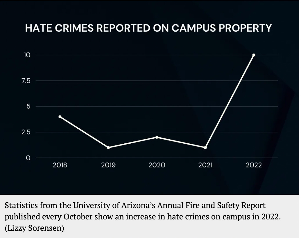 Hate crimes rising: The University of Arizona saw a steep increase in hate crimes reported on campus in 2022, the Daily Wildcat’s Lizzy Sorenson reports. The UA’s Annual Security and Fire Safety Report showed 10 hate crimes reported in 2022, with ASU reporting no hate crimes last year. The report defined a hate crime as a “criminal offense committed that manifests evidence that the victim was intentionally selected because of the perpetrator’s bias against the victim.”