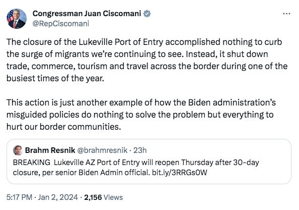 Back in business: The Lukeville port of entry is opening back up today, the Tucson Sentinel’s Paul Ingram writes. The port is the main way to cross the border into Mexico for people living in Ajo and other communities, as well as tourists going to Rocky Point. It was closed for a month after federal officials pulled staff from the port to help process migrants and asylum seekers. In a rare moment of agreement on a border issue, the closure sparked widespread bipartisan condemnation by officials from Arizona and Congress.