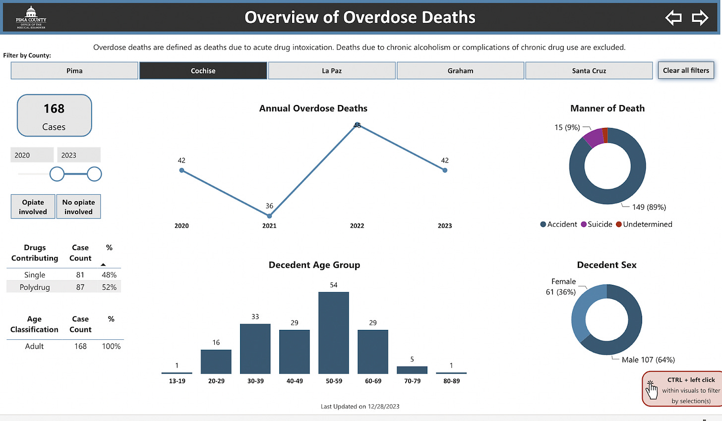 This includes Cochise County, which has been hit especially hard by the opioid crisis. In 2022, Cochise County saw its highest number of fatal drug overdoses since tracking began in 2012, with the 48 fatalities representing the county’s leading cause of non-natural deaths.