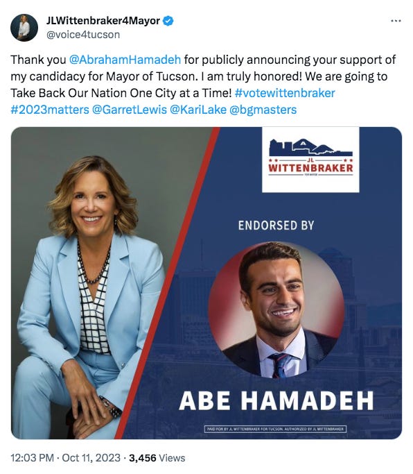 Wow, endorsed by “Honest Abe”! I guess we can expect a couple years of Wittenbraker claiming to be “the rightful mayor of Tucson” after she loses by 30-40 points.
