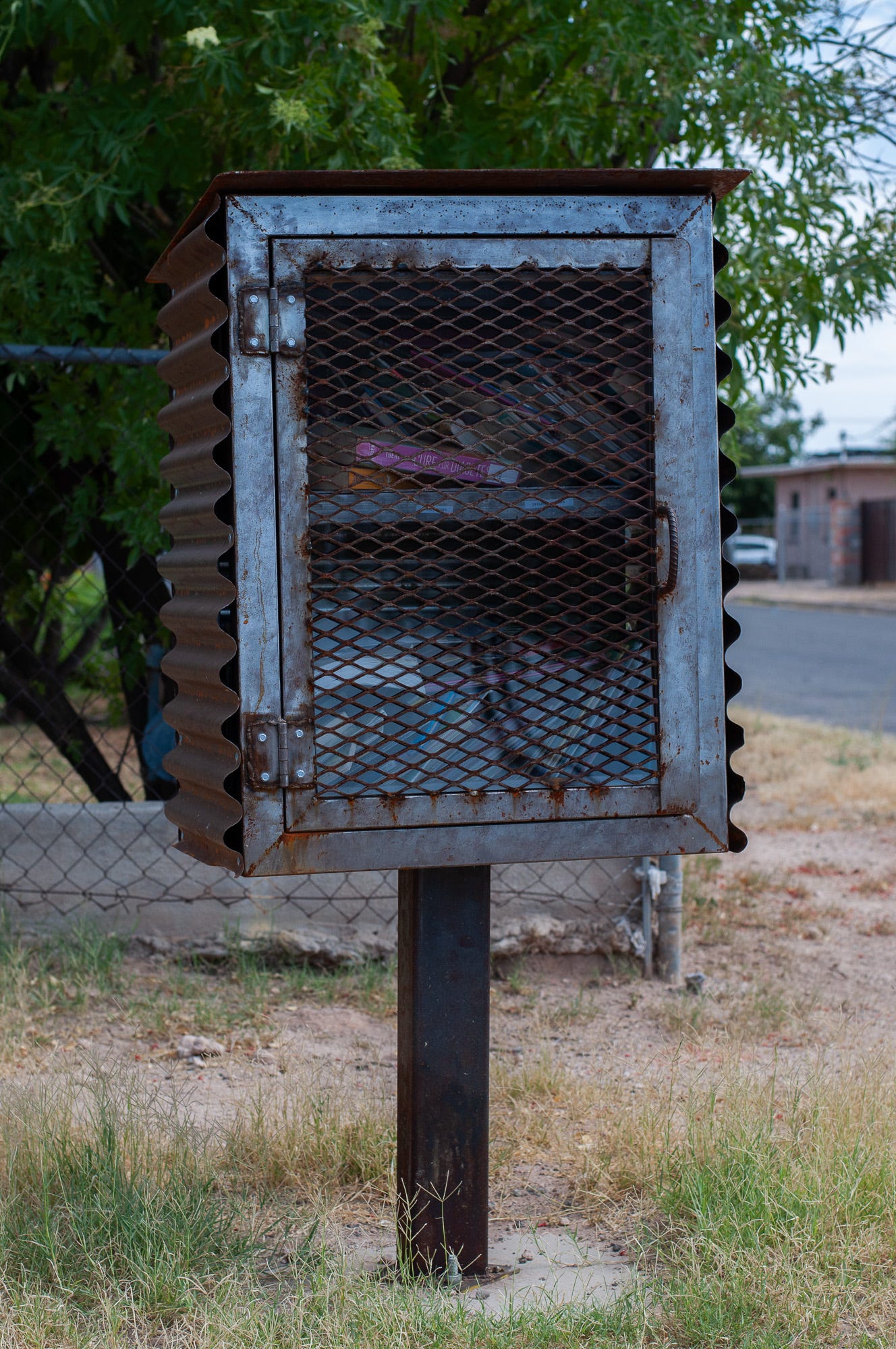 More than six months after its installation, the book bank is still standing and on a recent visit by the Tucson Agenda, it was full of books.