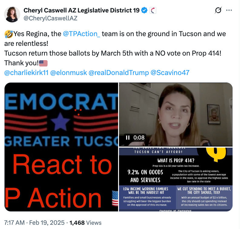 And incidentally, not just through the work of TPAction did Prop 414 go down. ALL of Tucson hated it, as evidenced by its losing spectacularly in almost all precincts. Republicans often if not always vote against raising taxes but it took a significant level of being out of touch with voters for this to lose as badly as it did. At least one council member who stumped for it won his race by a tiny tiny margin that should stand as an affront to his arrogance ( calling his own race early and later claiming that his opponent was " not a democrat") and inability to "read the room" filled by his constituents. Don't give TPAction credit they don't deserve-- Prop 414 was as big a local Democratic political catastrophe as the information coming out about who knew what, when? re the Data center.