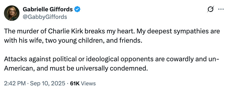 Since the shooting, Giffords has made multiple posts about Kirk on Twitter and how “like all Americans, he deserved to be safe from gun violence.”