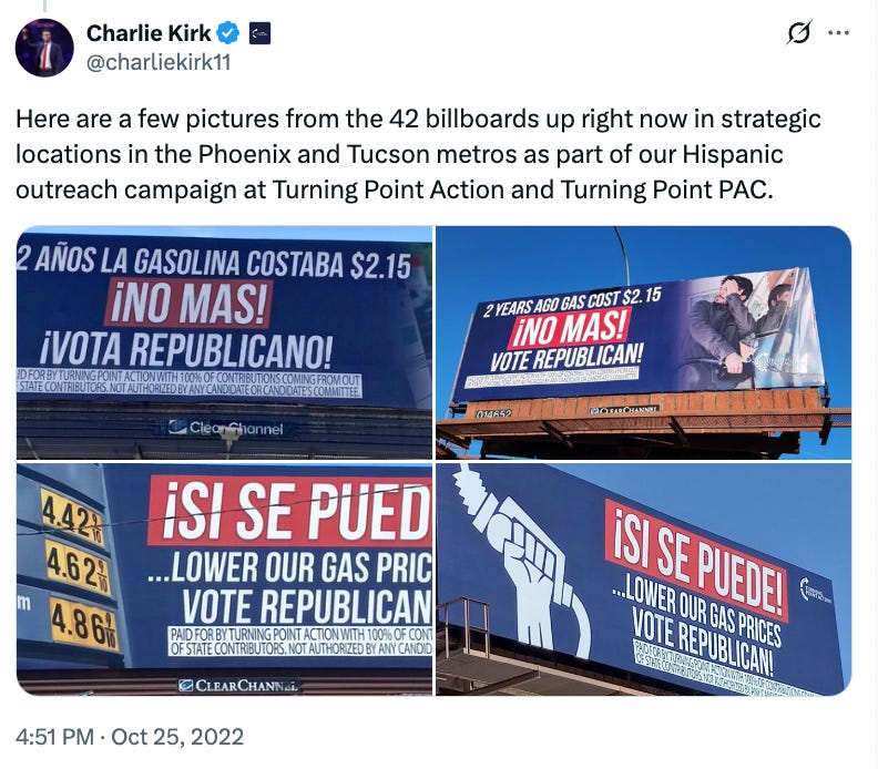 Tucson also was included in some of Turning Point’s statewide campaigns, including what Kirk called a targeted “Hispanic outreach campaign” during the 2022 election cycle. His organization rented out seven billboards in the Old Pueblo, urging Tucsonans in English and Spanish to vote Republican, focusing on high gasoline prices.
