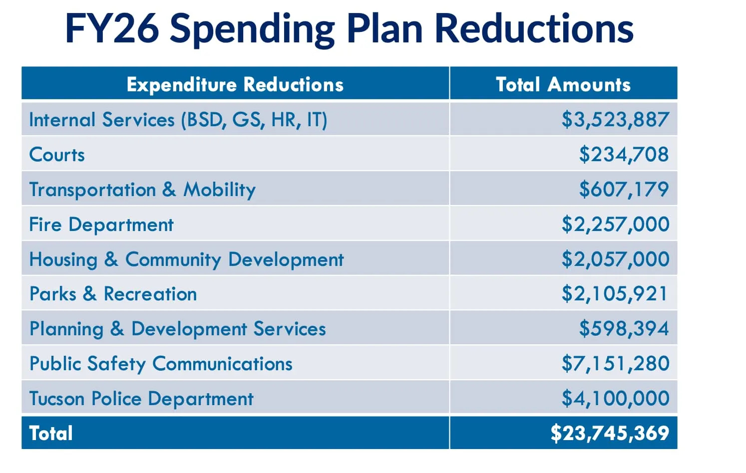 For example, the Tucson Police Department is facing the largest cut and will delay the hiring of additional Community Service Officers and cut $2 million that it had set aside for overtime for patrol officers.